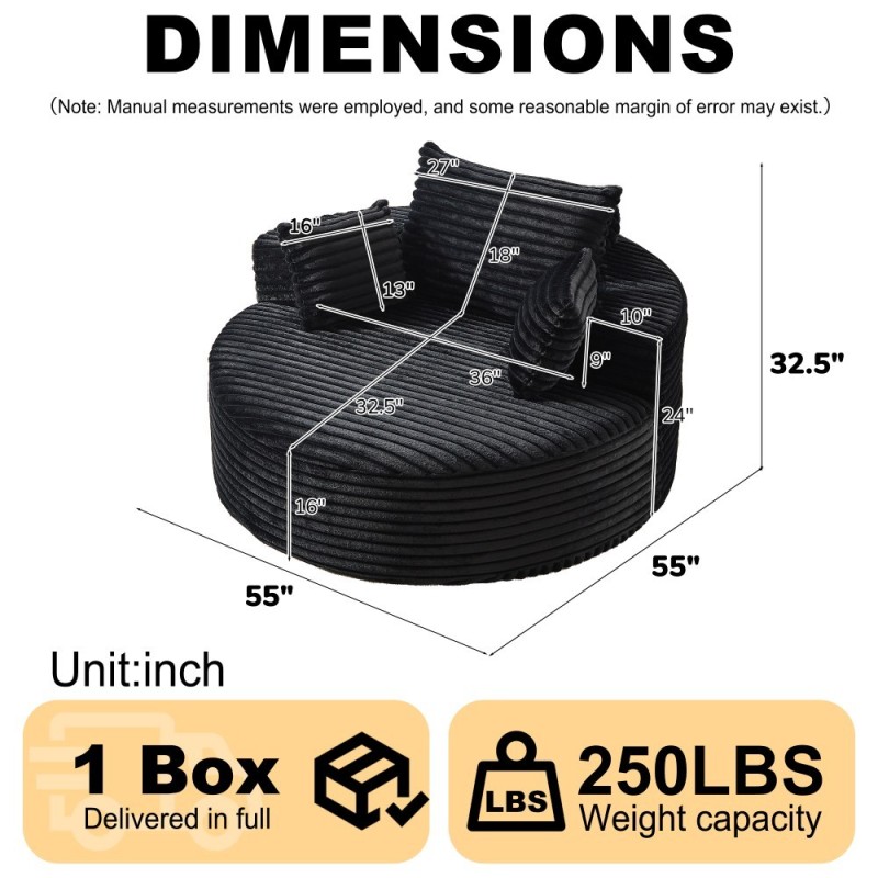The 55-inch Fluffy Modern Round Single Sofa offers a perfect blend of modern aesthetics and ultimate comfort. Crafted from premium Corduroy or Chenille fabric, it provides a luxuriously soft and textured feel with a subtle sheen for year-round warmth and elegance. The innovative backrest pillow design includes an extra cylindrical cushion to enhance head and neck support while reclining. Filled with high-resilience foam for lasting comfort and shape retention, this sofa arrives in compressed packaging with no assembly required—simply unbox, fluff, and watch it regain its full, plush form within 72 hours. Ideal as a standalone accent piece or in multiple units for flexible seating arrangements.
