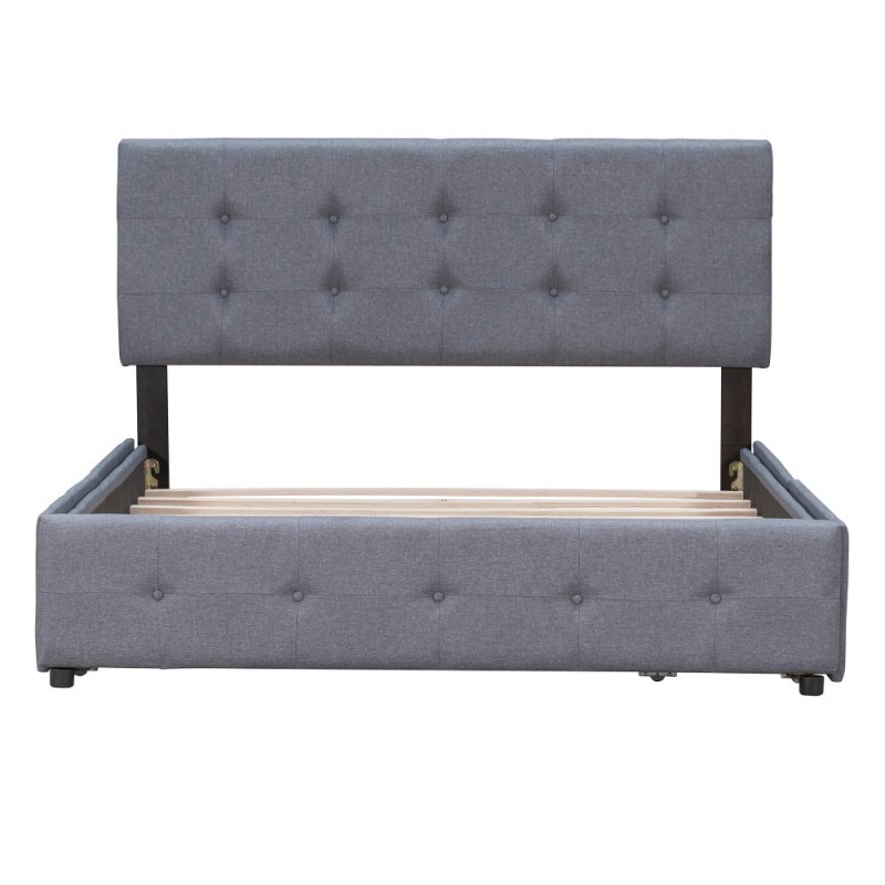 This upholstered platform bed is designed to bring modern elegance and practical storage to your bedroom. The bed features a tufted linen headboard, foam-filled for added comfort, giving the room a warm and refined look. Built with a solid MDF and particle board frame, it ensures excellent durability and stable support for long-term use.