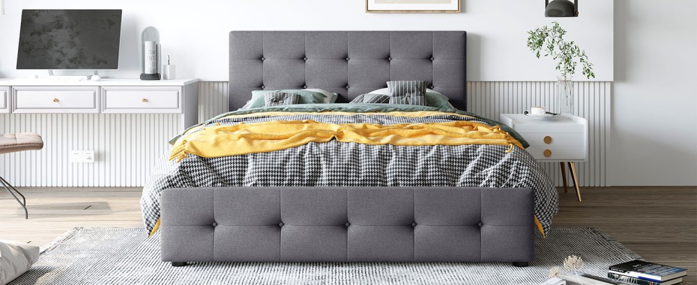 Queen Size Upholstered Platform Bed with Tufted Headboard and 4 Storage Drawers, No Box Spring Needed, Linen Fabric