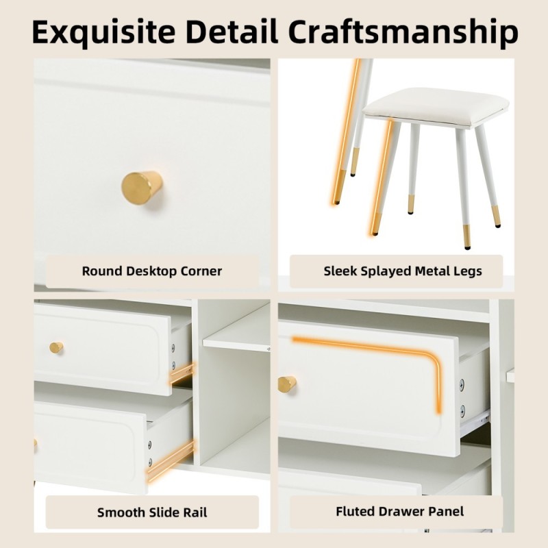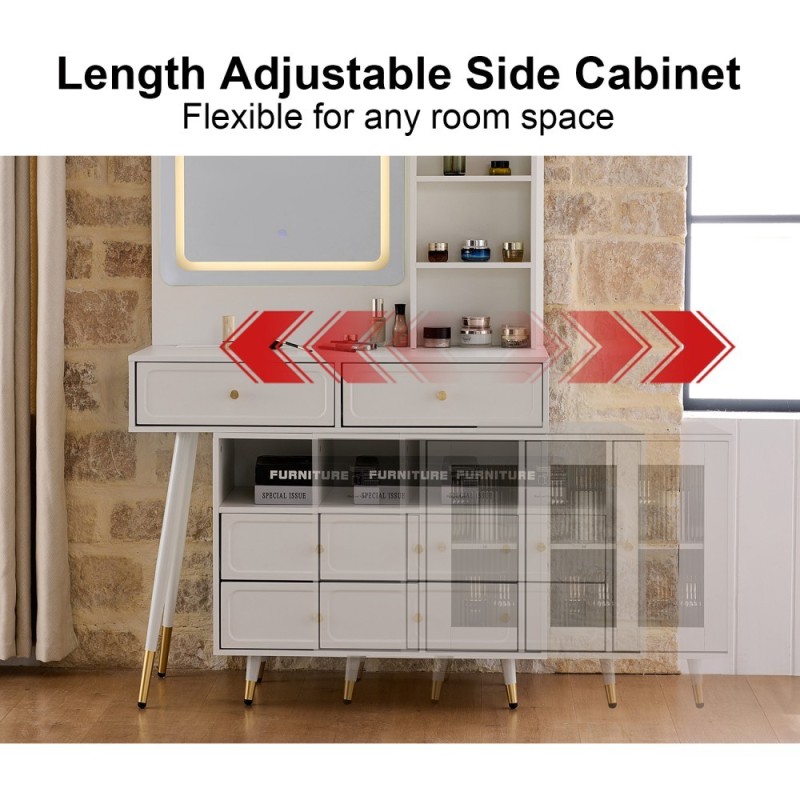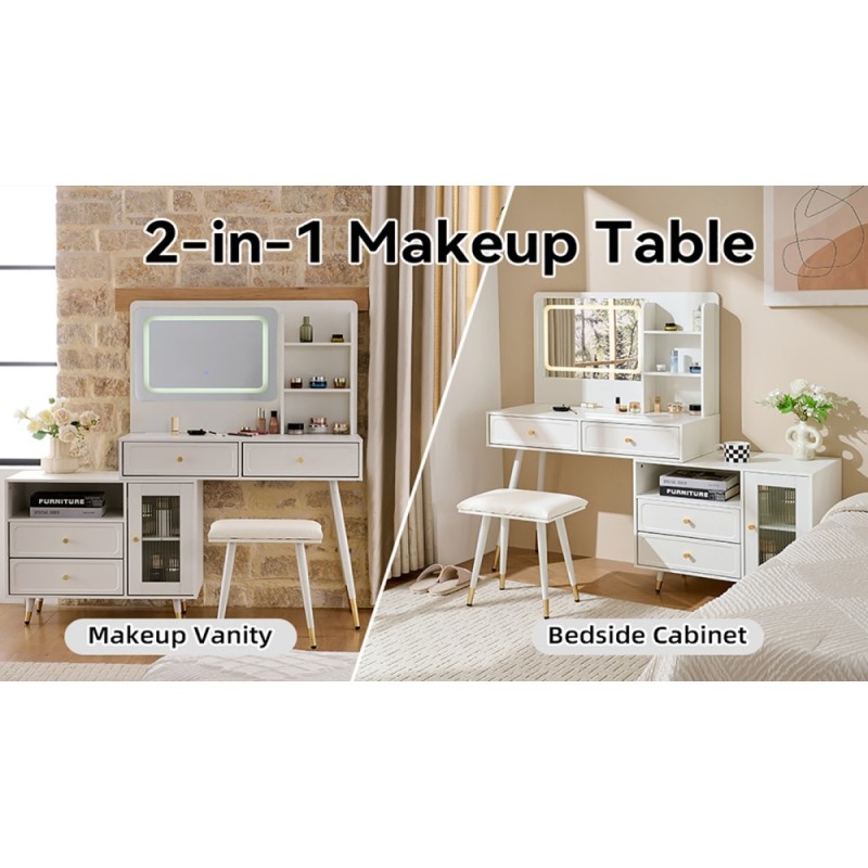 This modern vanity desk combines elegant design with practical functionality. The retractable structure allows you to adjust the length based on your room layout, while the HD mirror with 3-color LED lighting provides perfect illumination for daily beauty routines. Ample storage and a built-in power station make it a smart solution for compact bedrooms.
