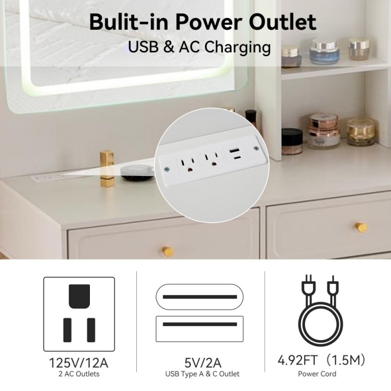 Built-in Power Strip: 2 AC outlets, USB port, and Type-C port