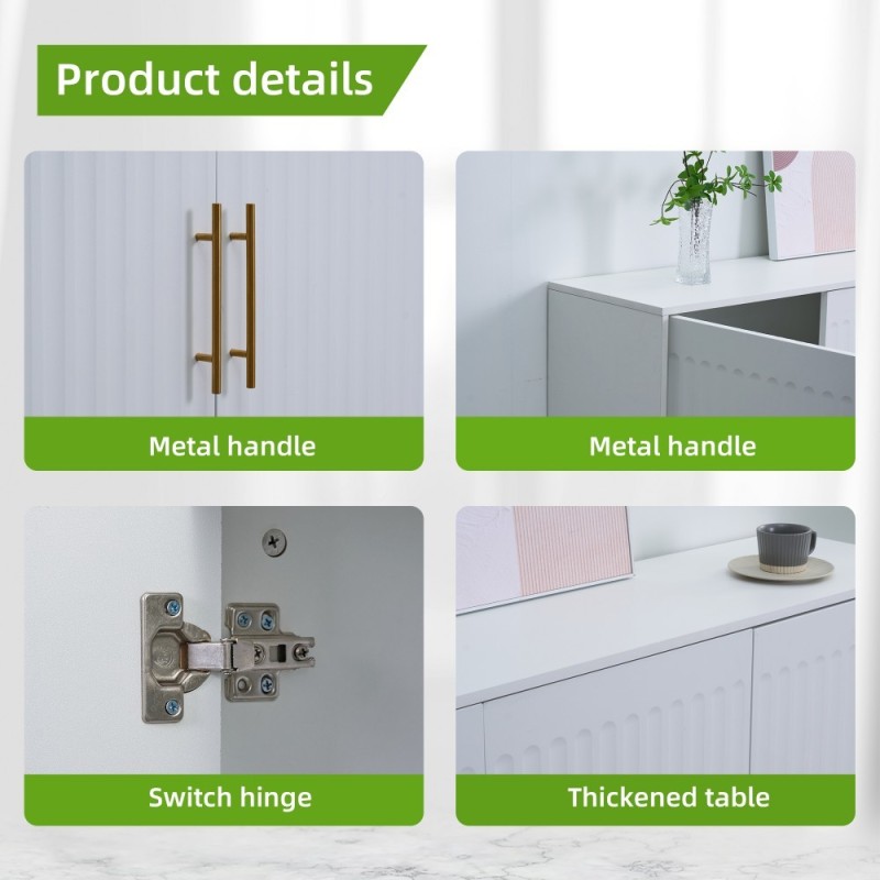 Behind the three doors, adjustable shelves provide ample space for tableware, appliances, linens, or household essentials, keeping your space organized and clutter-free. The blister-process fluted texture adds depth and character, while metal legs offer reliable strength and stability. With a top surface supporting up to 180 lbs, it also functions beautifully as a coffee bar, accent cabinet, or multifunctional storage console.