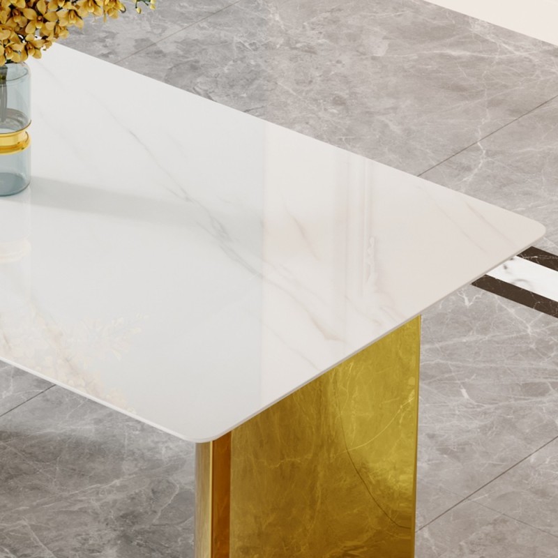 This modern minimalist dining table features a striking black patterned glass tabletop paired with elegant golden metal legs, creating a luxurious yet contemporary centerpiece for any dining or living space. The sleek rectangular design provides generous seating for family meals, gatherings, and stylish hosting. With its versatile aesthetic, it also functions beautifully as a display table or presentation table.