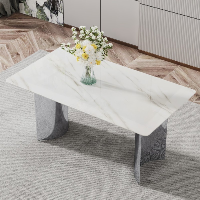 This modern minimalist dining table features a striking black patterned glass tabletop paired with elegant golden metal legs, creating a luxurious yet contemporary centerpiece for any dining or living space. The sleek rectangular design provides generous seating for family meals, gatherings, and stylish hosting. With its versatile aesthetic, it also functions beautifully as a display table or presentation table.