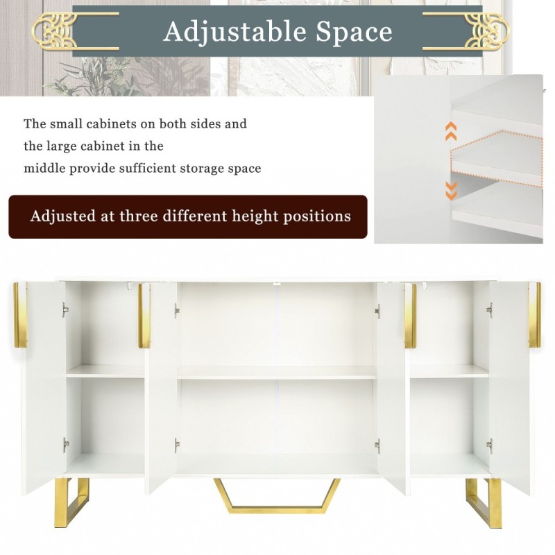 This modern luxury 4-door sideboard combines clean lines, a marble-texture top, and gold metal accents for a sleek, high-end look. Designed with a spacious interior and fully adjustable shelves, it offers versatile storage for dining rooms, kitchens, and living spaces. The pinstripe door pattern and matte black finish elevate any interior style with understated elegance.