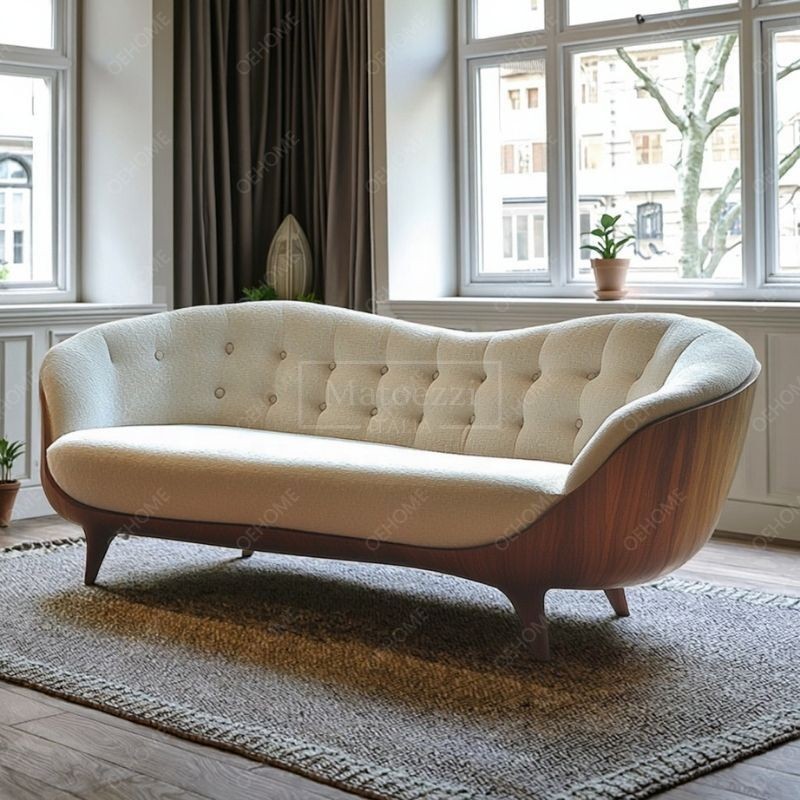 Bring timeless charm into your space with this mid-century modern 3-seater sofa, designed with a beautifully sculpted curved backrest and organic wooden frame. The flowing silhouette echoes natural forms, while the deep button tufting adds a sophisticated, tailored look.